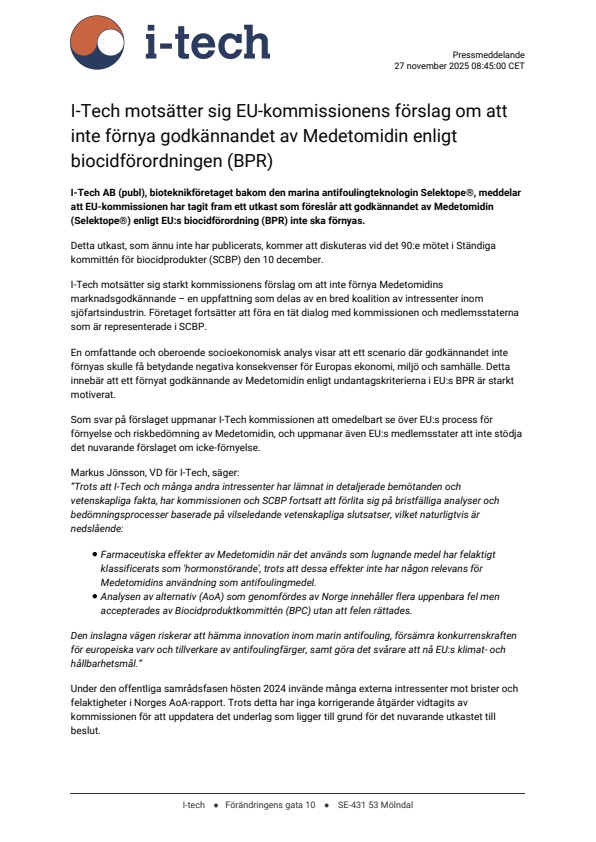 I-Tech AB (publ), bioteknikföretaget bakom den marina antifoulingteknologin Selektope®, meddelar att EU-kommissionen har tagit fram ett utkast som föreslår att godkännandet av Medetomidin (Selektope®) enligt EU:s biocidförordning (BPR) inte ska förnyas.