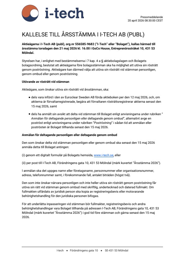 (ii) per post till I-Tech AB, Förändringens gata 10, 431 53 Mölndal (märk kuvertet ”Årsstämma 2026”).